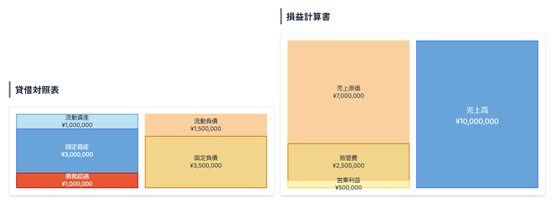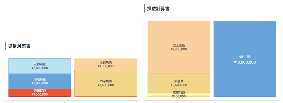 資産より負債の方が多く、純資産がマイナスの状態。このままだと経営の継続が危うくなる可能性があります。